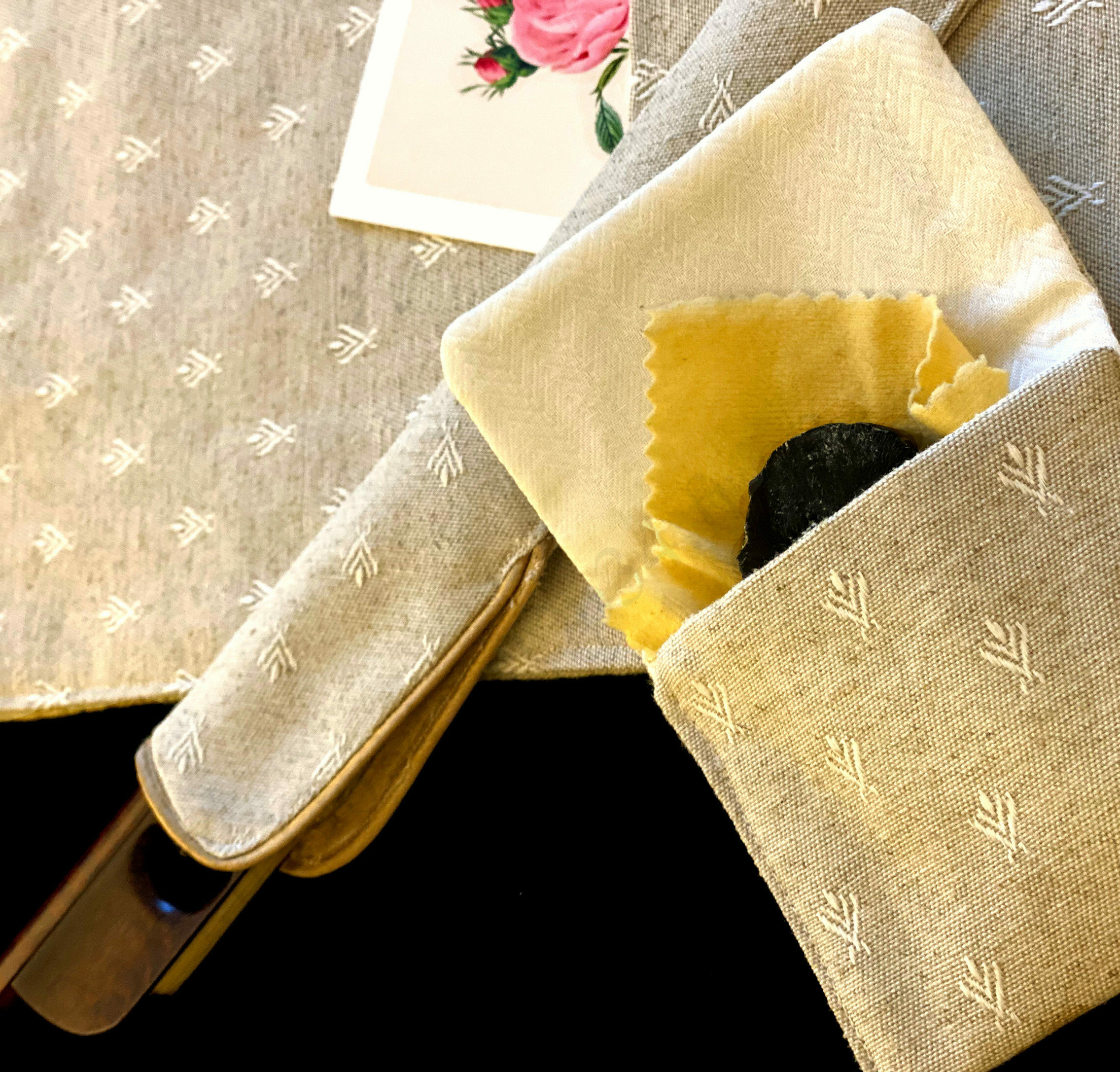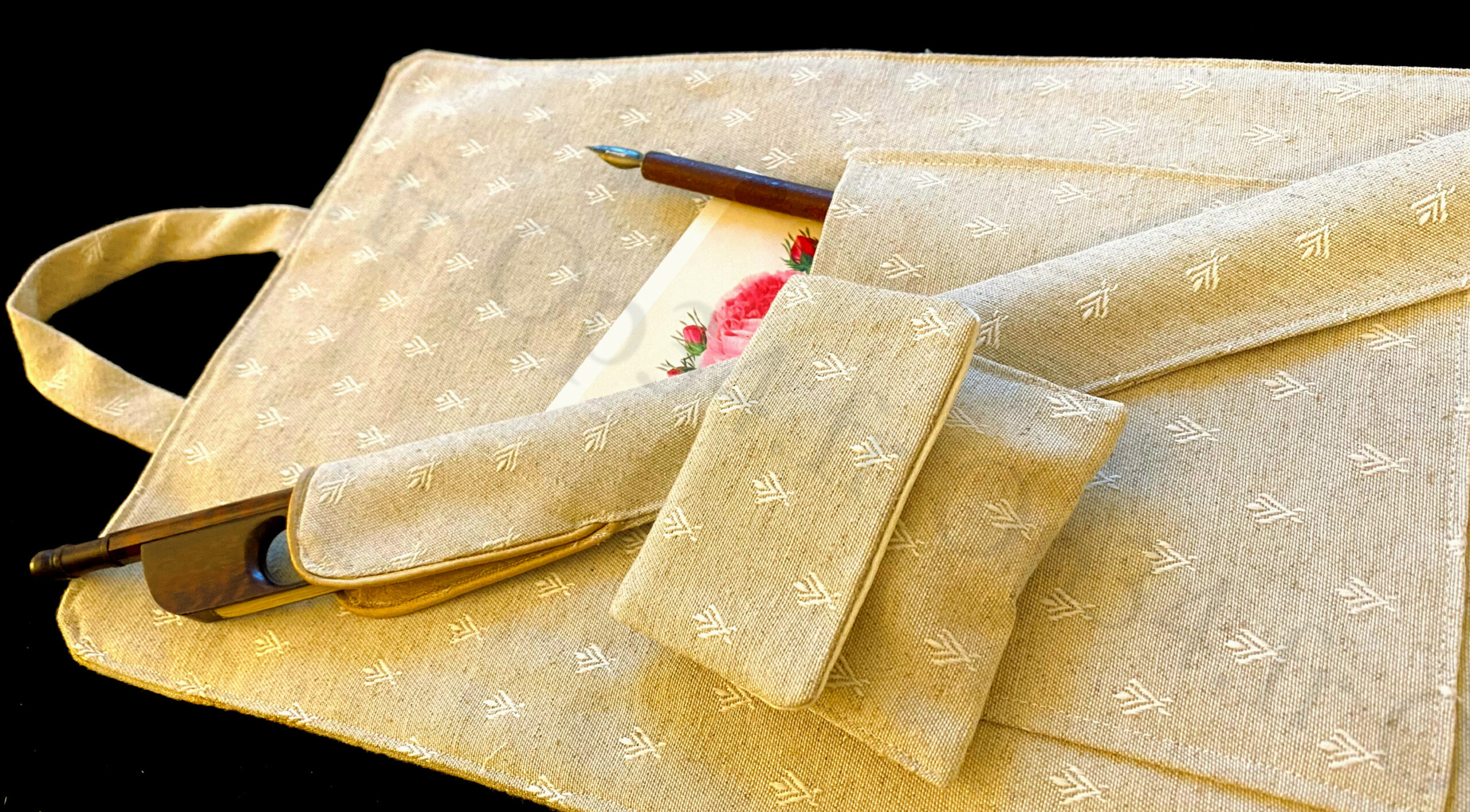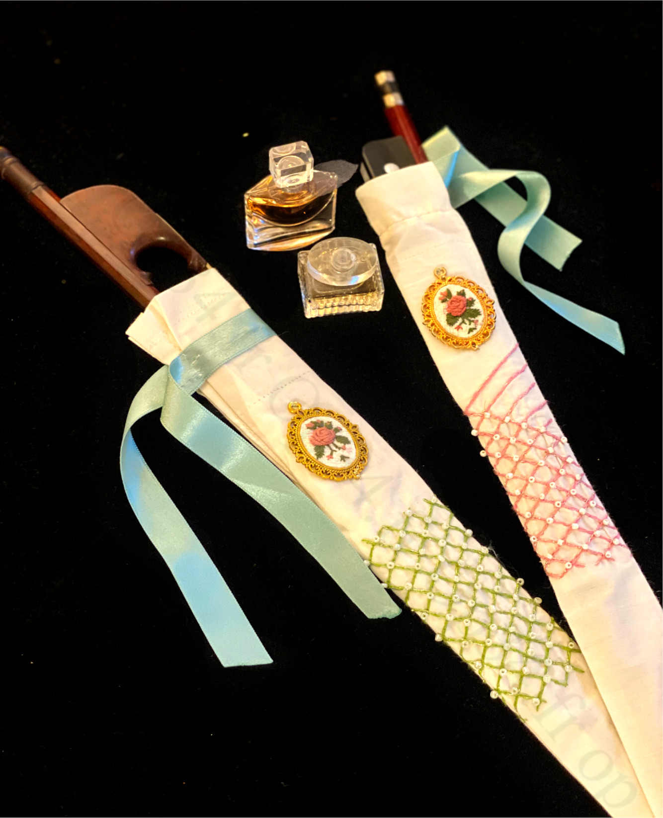 Ensemble composé d’une housse d’archet, d’une pochette à colophane et d’un bavoir à violoncelle, cousu main.