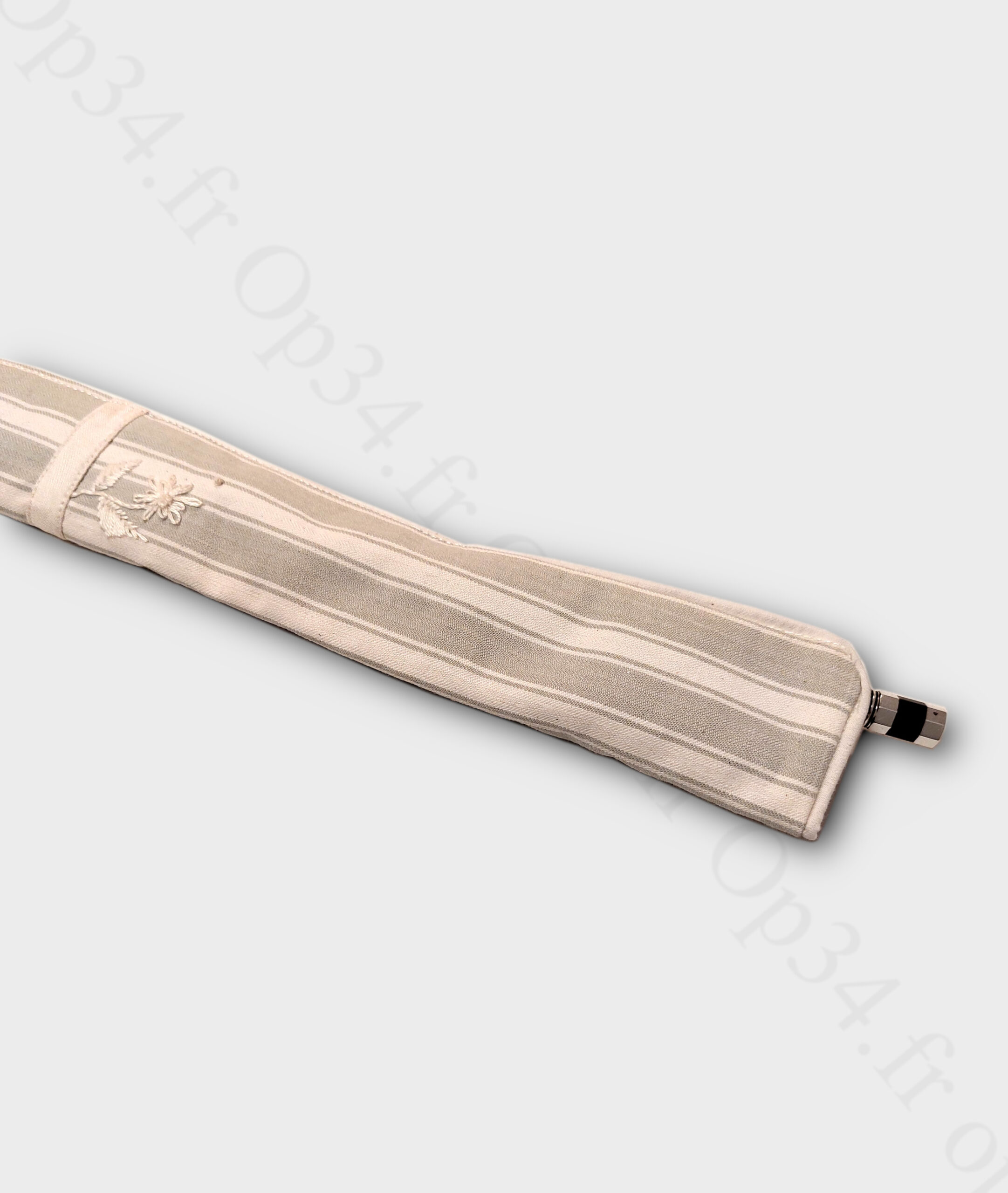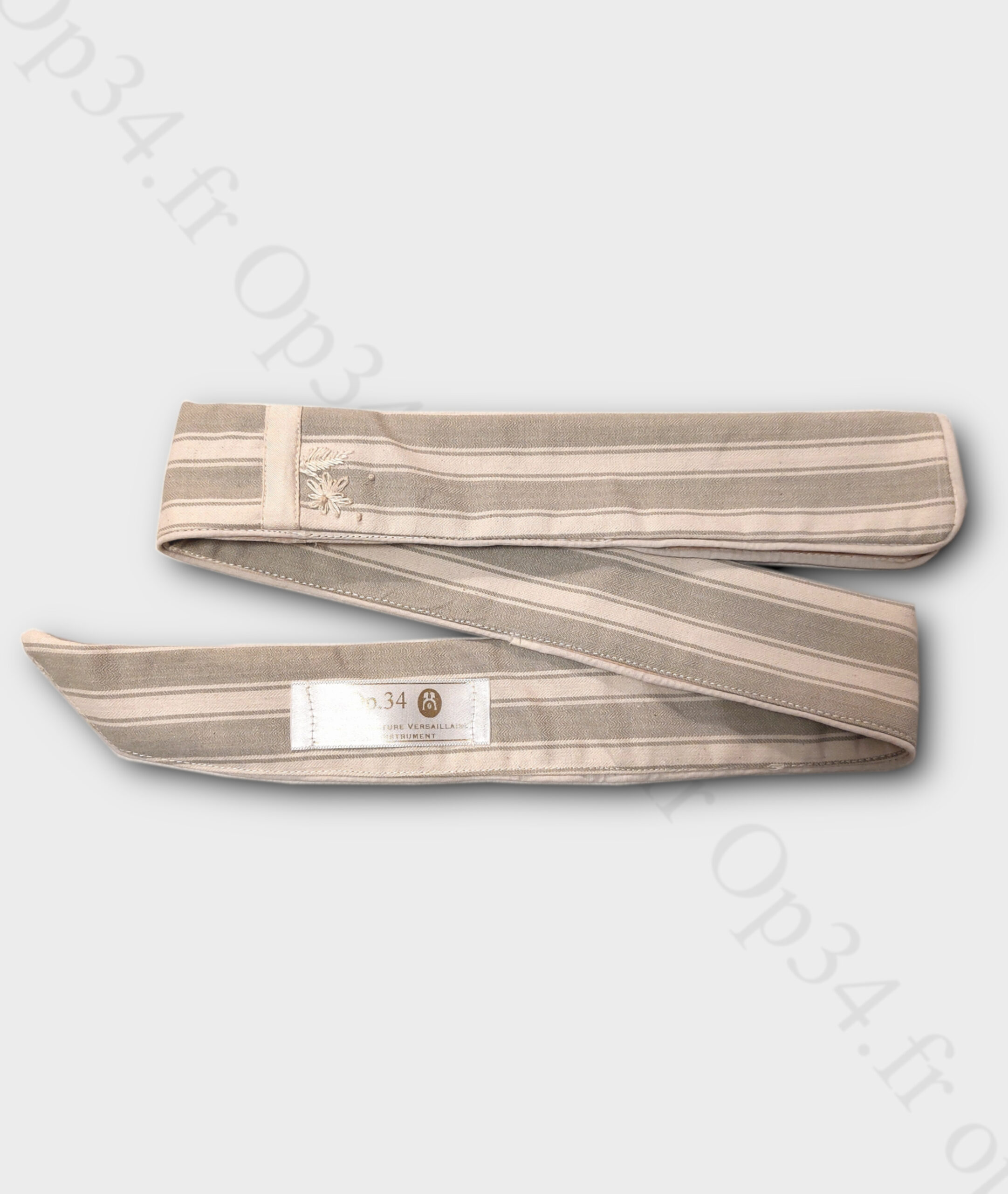 La housse est confectionnée dans un tissu beige aux motifs rayés, ce qui lui confère un aspect classique et intemporel. Les motifs sont délicatement tissés pour évoquer le raffinement et la noblesse de l’aristocratie.