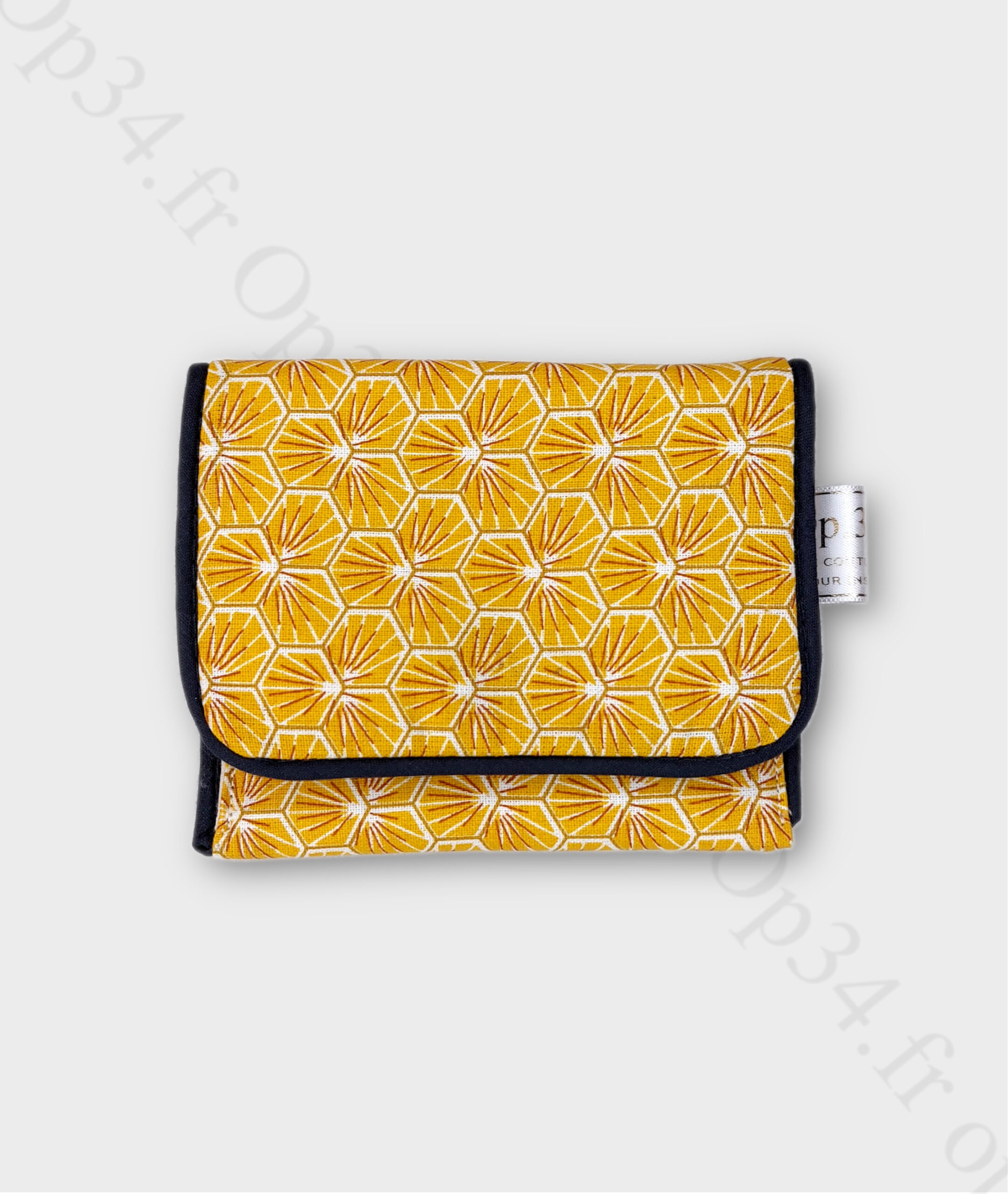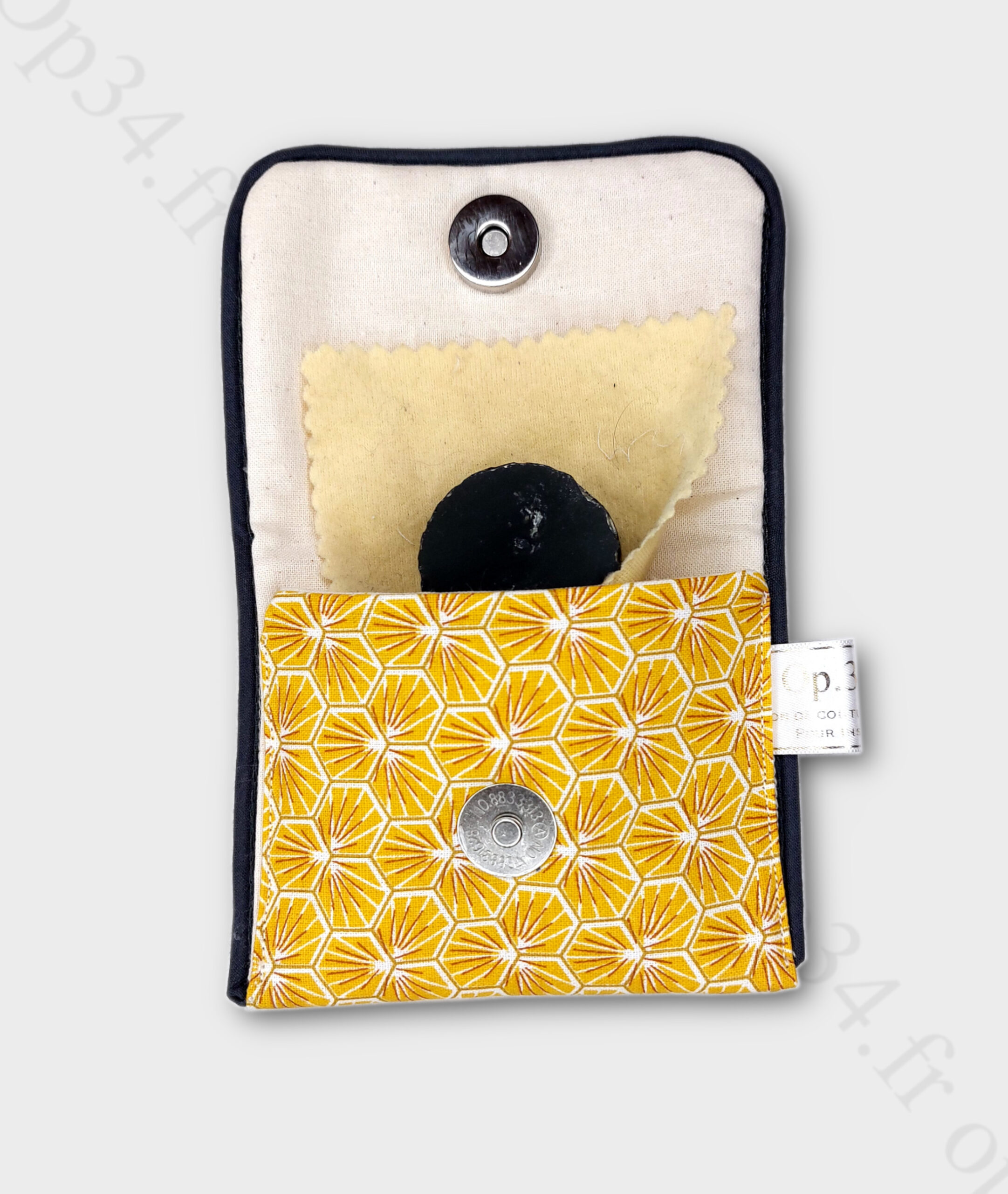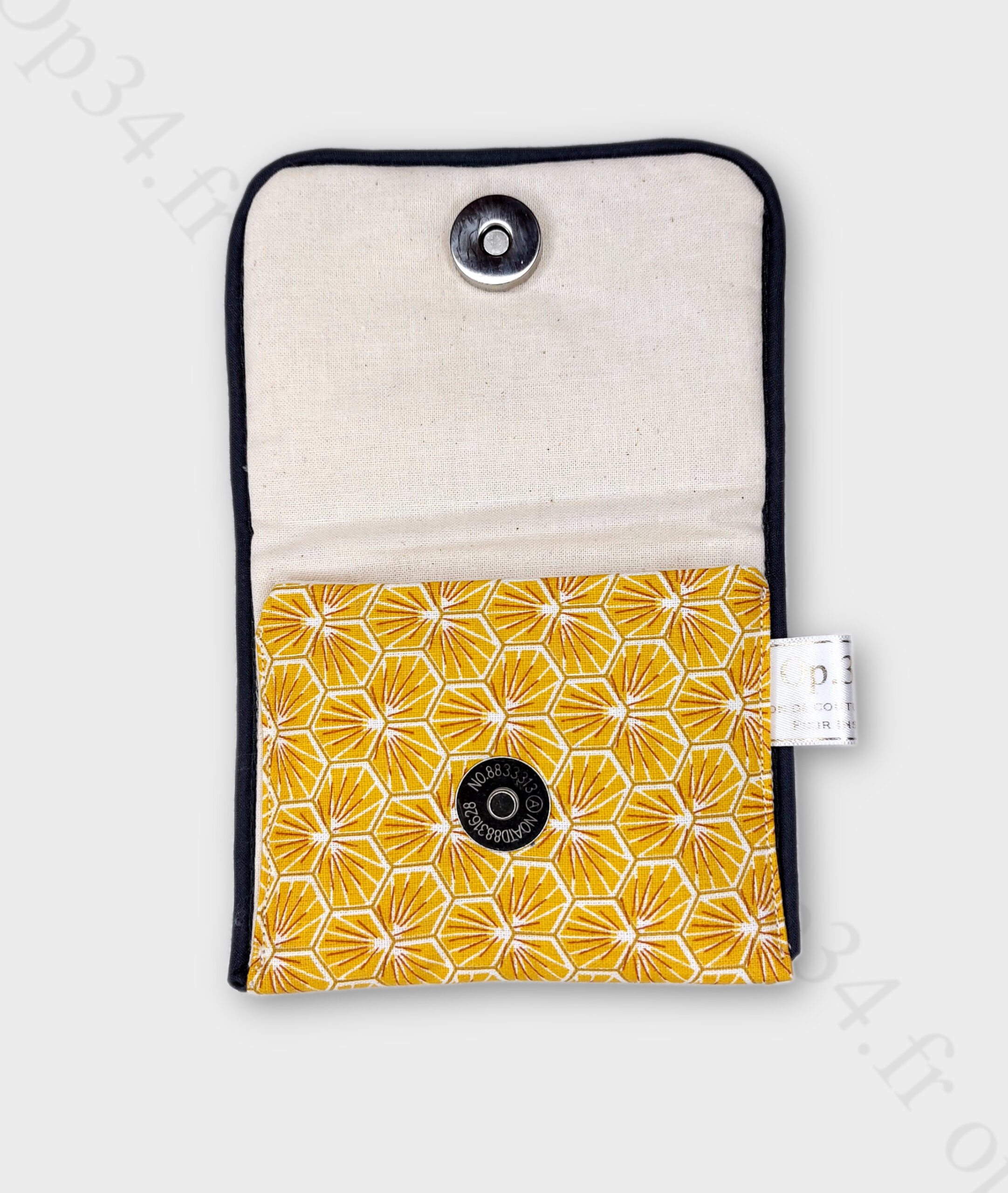 Le tissu extérieur présente un motif floral léger, ceux-ci sont inspirés des pistil de safran offrant une esthétique visuelle agréable. Il est rehaussé par un passe-poil couleur bleu foncé. un petit bouton vous permettra de facilement refermer la pochette.